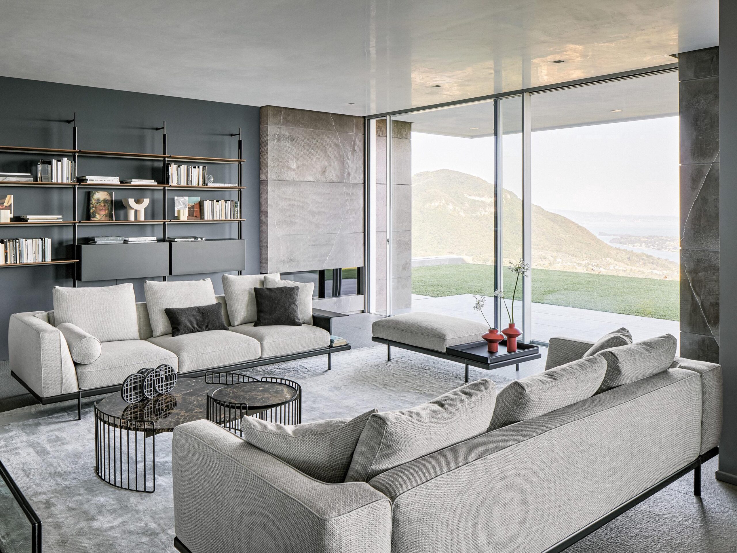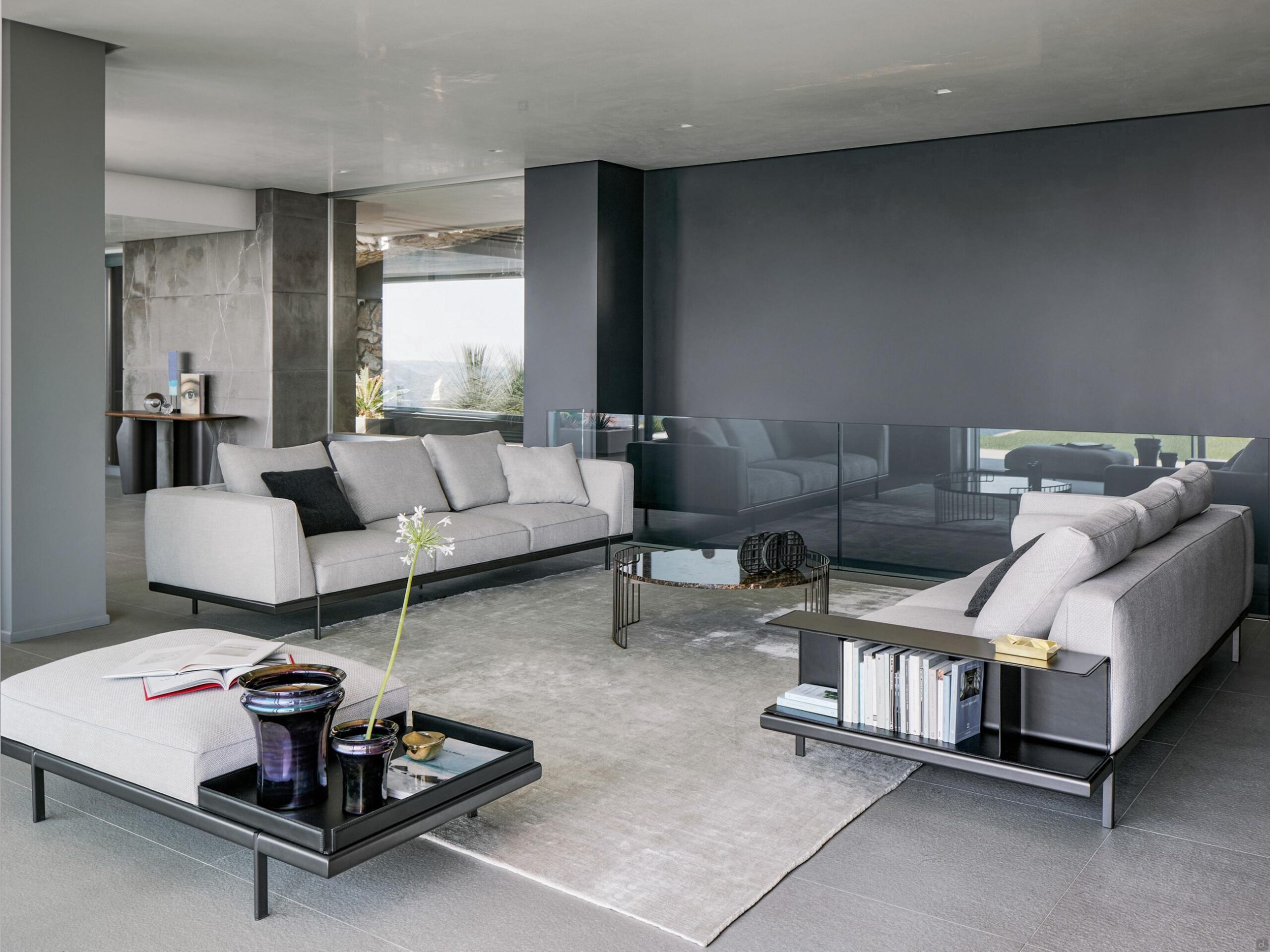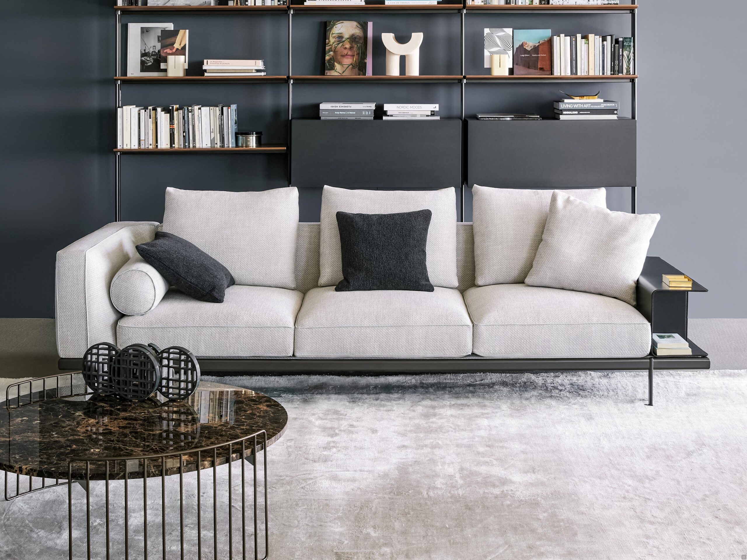 Phil de Bonaldo : canapé avec bibliothèque intégrée, aussi en L et avec méridienne. Accessoires en cuir tels qu’une table basse et un porte-revues.