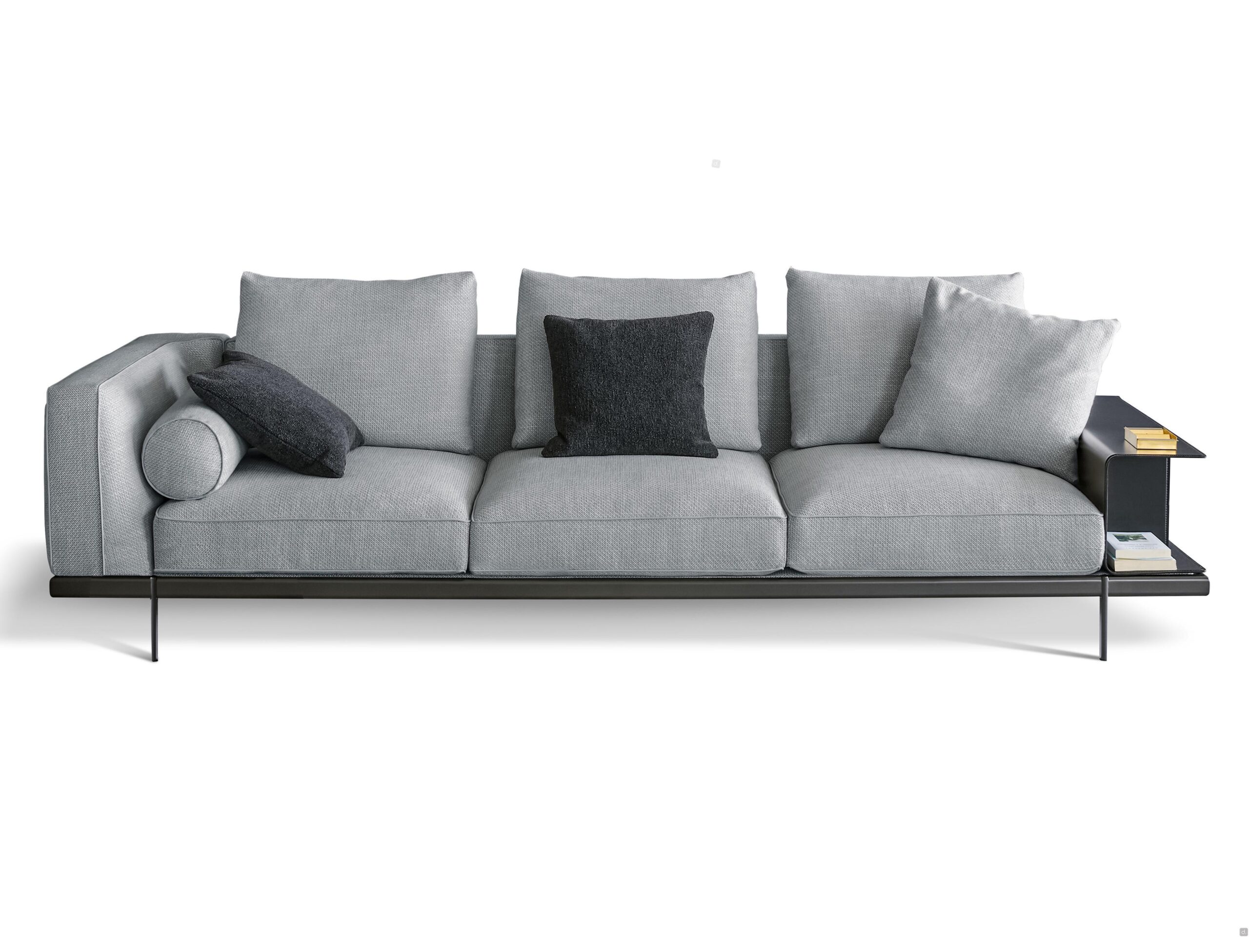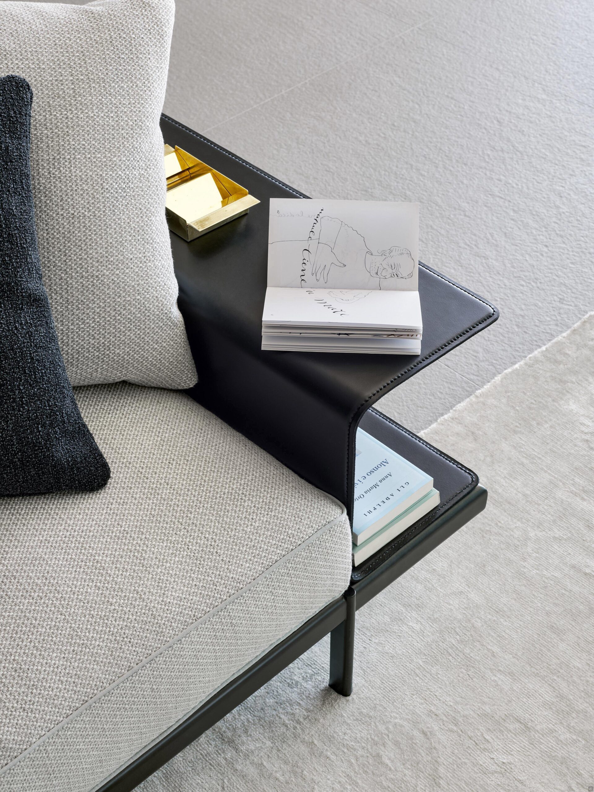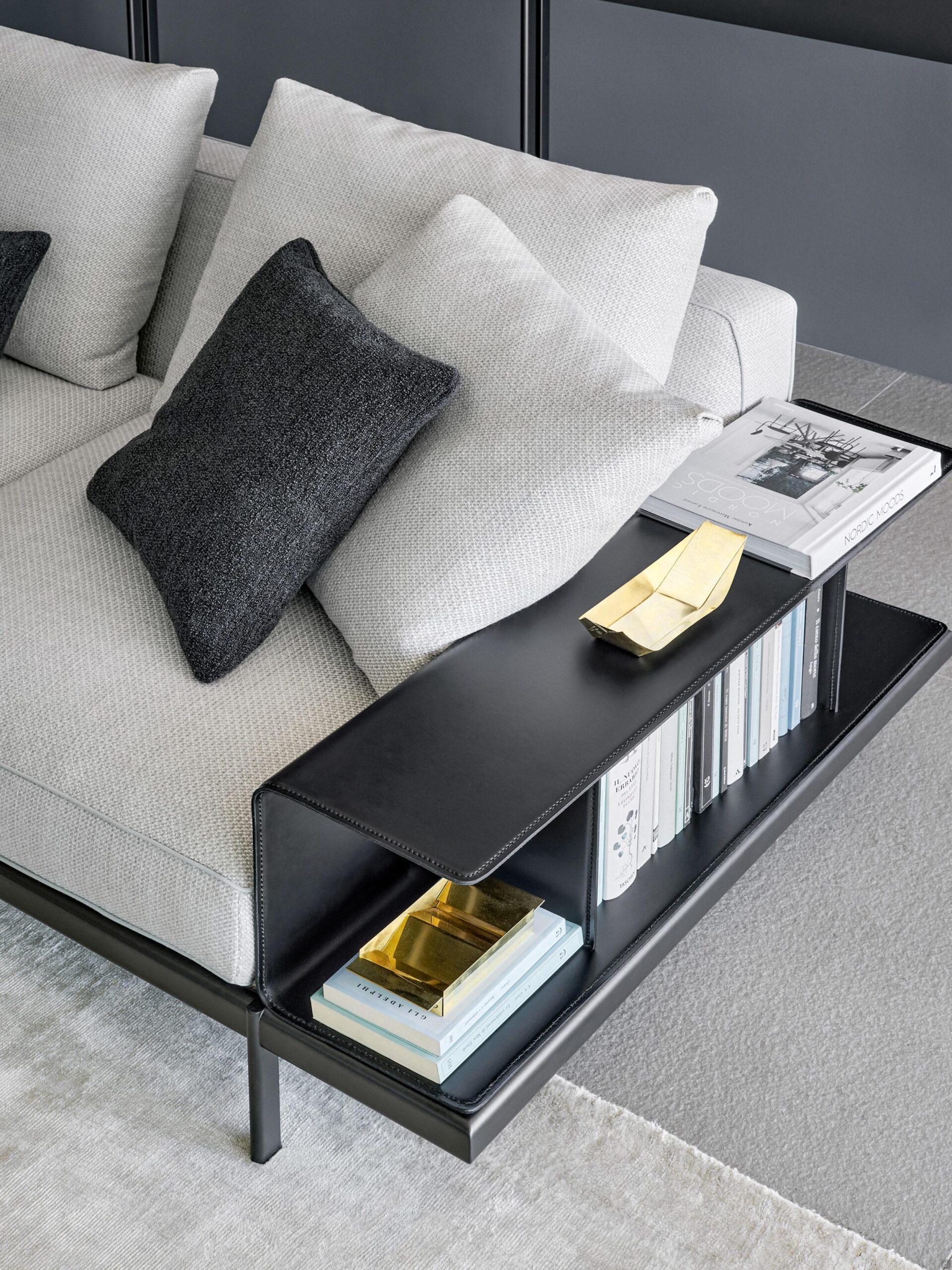 L’accoudoir-bibliothèque, une alternative au traditionnel accoudoir large et rembourré, est l’une des caractéristiques les plus reconnaissables de Phil, mais ce n’est pas le seul accessoire en cuir disponible pour personnaliser votre canapé. Le même matériau est utilisé pour fabriquer des accoudoirs fins qui peuvent être complétés par un coussin décoratif, ou la table rectangulaire pour les éléments à méridienne ou panoramiques.