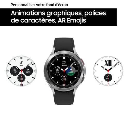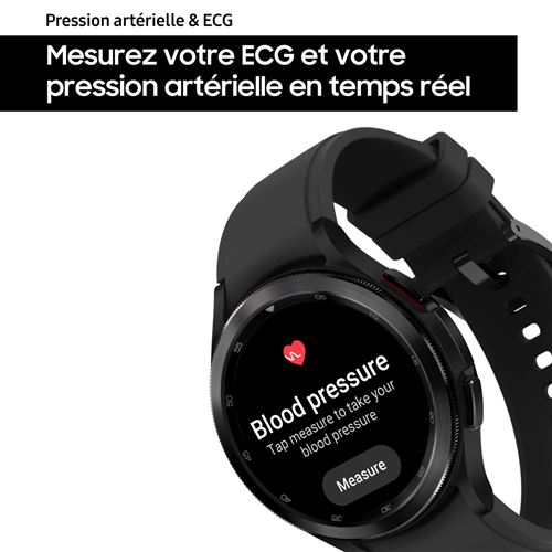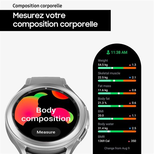 DIMENSIONSProduit nu : 45,5 x 45,5 x 11,0 mmPoids produit avec bracelet : 52gProduit packagé: 110.0 x 150.0 x 53.0 mmPoids: 110gLargeur du bracelet : 20 mmMatière : acier inoxydableÉCRANTaille : 1,36circulaireSuper AMOLED Full Color AOD 16Millions450 x 450 pixels (330PPI)Face avant : Gorilla Glass DXFace arrière : Cadran 3D GlassBATTERIECapacité : 361 mAh • Charge complète en 1h40Charge sans filMÉMOIRERAM : 1,5 GoStockage : 16 Go (2)PROCESSEURExynos W920OSAndroid WearSurcouche One UI Watch 3.5Gestion depuis smartphone : application Galaxy WearableCOMPATIBILITÉGamme Galaxy S (S6 et ultérieurs)Gamme Galaxy Note (Note8 et ultérieurs)Gamme Galaxy A et J (2016 et ultérieurs)Gamme Galaxy ZSmartphone Android 6.0 et versions ultérieures avec 1,5 Go de RAM(6)Galaxy Buds (Buds+ et supérieurs)RÉSISTANCE AUX ÉLÉMENTS5 ATM (étanche jusquà 50 m) selon la norme ISO Standard 22810:2010.Certification IP68Certification militaire US Standard : MID STD 810 GCONNECTIVITÉBluetooth 5.0Wi-Fi 2.4 GHz & 5 GHzNFCCAPTEURSGPS, Glonass, Beidou, GalileoAccéléromètre, GyroscopeBaromètre altimètreCapteur de santé 3 en 1 : PPG + ECG + BIA2 électrodes pour mesure de lECG2 électrodes pour lanalyse corporelleMicrophone & haut parleurLuminosité ambianteBoussoleFONCTIONNALITÉS SPORT & BIEN-ÊTREApplications de bien-être avancées :Nombre de pas, calories brûléesHeures en mouvement, étages grimpésDémarrer un exercice, analyse de la foulée, Vo2 maxMesure de la fréquence cardiaque en continu:ElectrocardiogrammeMesure de la tension artérielleSpO2 (sur demande et pendant le sommeil)Analyse composition corporelle en 15s, Analyse du sommeil, gestion améliorée dusommeil, Détection des ronflementsSuivi du stress, exercices de rel
